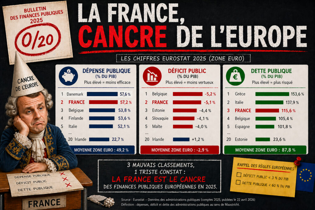La publication par Eurostat, l’institut de statistiques de l’UE, des dernières comparaisons entres les économies européennes en 2025 vient confirmer ce que l’on savait déjà : l’état catastrophique des finances publiques de la France, qui reste le cancre de l’économie européenne, le tout sur fond de régression du niveau de vie.